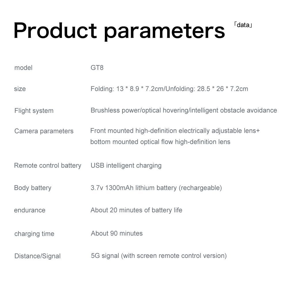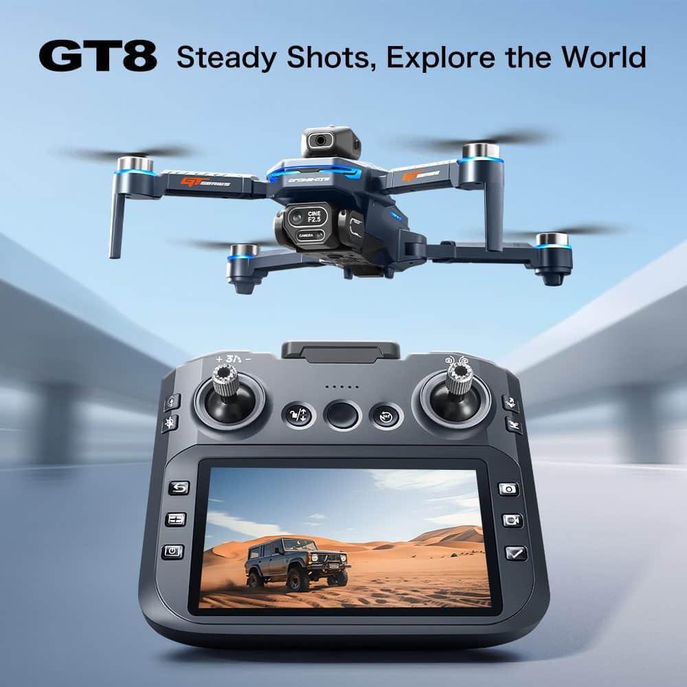 Le drone GT8 est équipé d'un écran distant de 4,3 pouces qui améliore l'expérience utilisateur grâce à sa conception avancée de l'objectif, qui intègre une stabilité accrue et la technologie EIS (stabilisation électronique de l'image) pour des photos plus nettes. Ce modèle est équipé d'un mode de maintien de l'altitude et d'un positionnement par flux optique, garantissant des performances de vol stables. De plus, le drone comprend un écran LCD pratique sur son boîtier et permet aux utilisateurs de personnaliser les itinéraires de vol en dessinant les trajectoires souhaitées directement dans l'application qui l'accompagne.