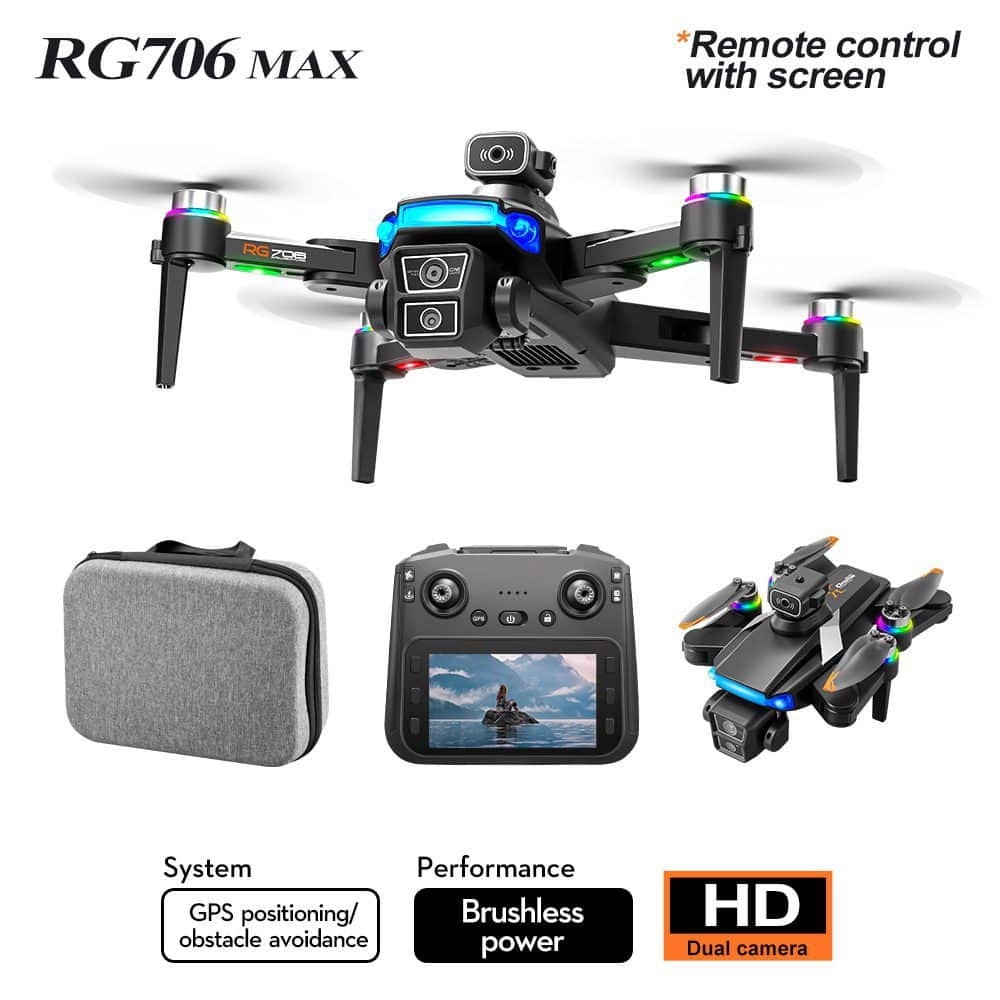 Le RG706MAX est équipé de fonctionnalités avancées, notamment une caméra 4K HD et un écran de commande à distance 4,5 HD innovant, garantissant une image de haute qualité et une utilisation conviviale. Il offre une transmission d'images en temps réel 5G ainsi que diverses fonctionnalités GPS telles que le suivi intelligent, le vol stationnaire et la prise de photos par gestes. Le double système de positionnement GPS et optique améliore la précision de la navigation, tandis que la fonction d'évitement d'obstacles à 360° garantit un fonctionnement sûr. Parmi les autres fonctionnalités, citons les fonctions de retour intelligent, qui font de ce drone GPS un choix polyvalent pour la photographie aérienne et l'exploration.