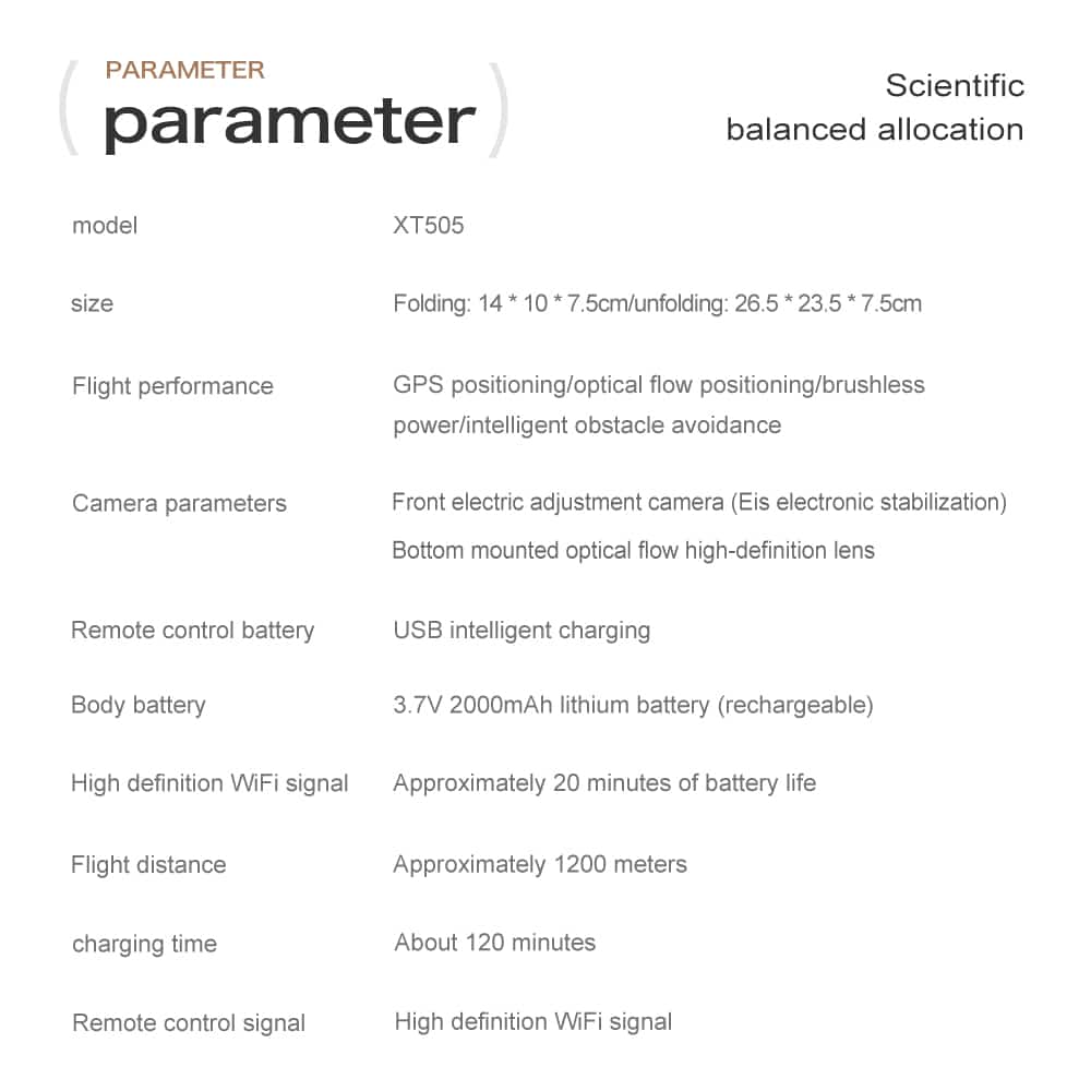 Le XT505 est un drone GPS riche en fonctionnalités qui allie à la perfection une imagerie professionnelle et un style visuel captivant. Conçu pour un vol stable jusqu'à 1,2 kilomètre, il utilise un GPS intégré et un positionnement par flux optique pour une navigation précise et un vol stationnaire fiable. Sa caméra 4K HD, équipée d'un réglage électrique avant et d'une stabilisation EIS, capture des images fluides et de haute qualité, aidée par un objectif à flux optique inférieur. Des fonctions intelligentes d'évitement d'obstacles et de retour automatique complet, activées en cas de perte de signal, de batterie faible ou de dépassement des limites de distance, garantissent la sécurité opérationnelle. Amélioré par un éclairage dynamique et tendance, il offre à la fois des performances robustes et une présence remarquable pour la photographie aérienne et les vols de nuit.