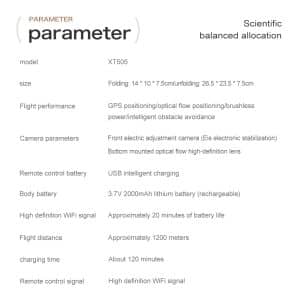 Le XT505 est un drone GPS riche en fonctionnalités qui allie à la perfection une imagerie professionnelle et un style visuel captivant. Conçu pour un vol stable jusqu'à 1,2 kilomètre, il utilise un GPS intégré et un positionnement par flux optique pour une navigation précise et un vol stationnaire fiable. Sa caméra 4K HD, équipée d'un réglage électrique avant et d'une stabilisation EIS, capture des images fluides et de haute qualité, aidée par un objectif à flux optique inférieur. Des fonctions intelligentes d'évitement d'obstacles et de retour automatique complet, activées en cas de perte de signal, de batterie faible ou de dépassement des limites de distance, garantissent la sécurité opérationnelle. Amélioré par un éclairage dynamique et tendance, il offre à la fois des performances robustes et une présence remarquable pour la photographie aérienne et les vols de nuit.