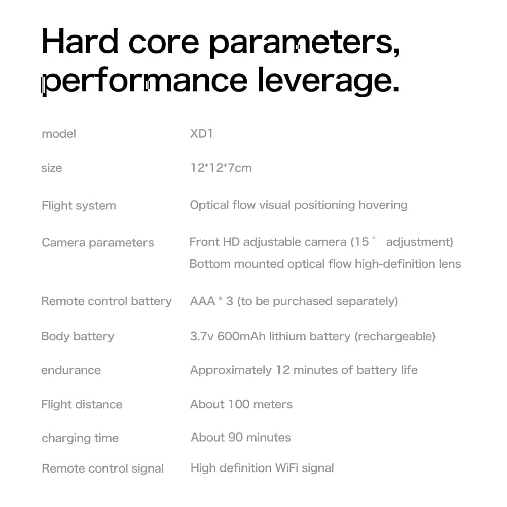 Le XD1 est un mini-drone compact et résistant en alliage, conçu pour être portable et offrir un vol stable. Son système de positionnement par flux optique garantit un vol stationnaire précis et un maintien en altitude fluide, idéal pour les environnements intérieurs ou extérieurs calmes. Le mode sans tête intégré simplifie le fonctionnement en éliminant le besoin d'ajuster manuellement l'orientation. Construit avec un châssis en alliage robuste, il offre une résistance accrue aux chocs et aux chutes. Équipé d'une caméra HD intégrée, il permet aux utilisateurs de capturer sans effort des photos et des vidéos aériennes nettes. Alliant résilience, commandes intuitives et performances fiables, c'est un excellent drone d'entrée de gamme pour les débutants et les pilotes occasionnels.