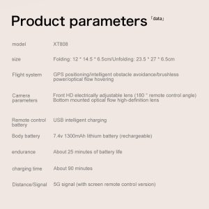 Le drone GPS professionnel XT808 est conçu pour offrir une imagerie aérienne fiable et de haute qualité. Il est équipé d'un écran HD distant de 4,5 pouces avec télémétrie de la batterie en temps réel pour une gestion éclairée du vol. Sa caméra 4K HD fournit des images nettes, diffusées en direct via une transmission 5G stable. Grâce à la combinaison du GPS et du positionnement par flux optique, il garantit un vol stationnaire précis et stable. La sécurité avancée est assurée par un système intelligent d'évitement d'obstacles à 360° et des fonctions complètes de retour automatique. Pour un tournage créatif, il offre un suivi intelligent, un vol en surround et un retour en une seule touche, ce qui en fait un outil polyvalent pour le pilotage autonome et manuel.