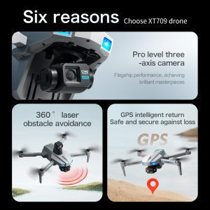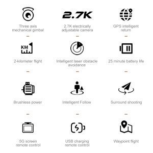 Drone GPS professionnel, distance de vol de 3 kilomètres,stabilisation électronique EIS à trois axes, pointage GPS, écran de contrôle à distance HD 4,5 pouces, transmission d'images en temps réel 5G, suivi GPS surround, positionnement GPS, positionnement par flux optique, double mode GPS + flux optique, retour GPS par simple clic, retour GPS intelligent (retour en cas de distance excessive, retour en cas de batterie faible, retour en cas de fuite), évitement intelligent des obstacles par laser, caméra 4K haute définition, suivi GPS intelligent, vol surround.